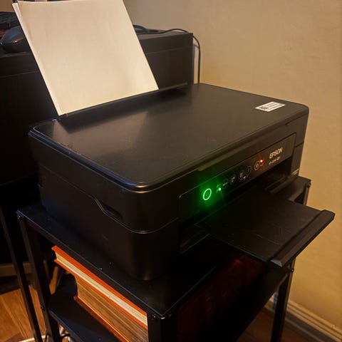 Epson XP-2150 multifunksjonsskriver i svart. Skriveren er en kompakt alt-i-ett-enhet som kan skrive ut, skanne og kopiere dokumenter. Modellen støtter trådløs tilkobling via Wi-Fi, noe som gjør det mulig å skrive ut fra flere enheter på samme nettverk. Egnet for hjemmebruk eller mindre kontorer som trenger en enkel løsning for daglige utskrifts- og skanneoppgaver.