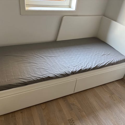 IKEA dagseng er en enkeltseng/dobbeltseng med ryggpanel. Den har også to uttrekksskuffer under som gir god oppbevaringsplass.