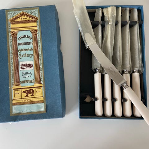 Atkinson Brothers knivsett bestikk med hvite håndtak. Settet består av flere små kniver med metallblad og håndtak i lys farge, levert i original eske merket «Atkinson Brothers Celebrated Cutlery, Milton Works, Sheffield». Egnet som bordkniver eller til servering. Klassisk design med rette blader og enkle håndtak.
