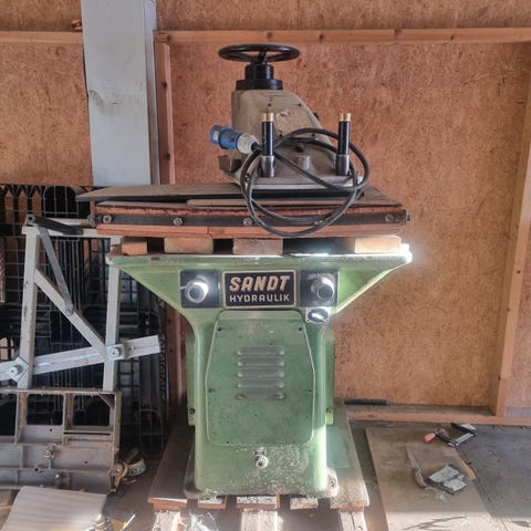 Søyleborrmasking med fot for gulvmontering. Er med en hel haug med borrer og tilbehør.