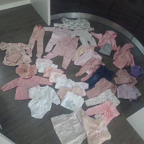 Selger en klespakke til jente i str. 62. ( 3mnd ). Klærne er godt brukt, og bærer preg av oppbevaring ( skrukkete bl.a, men alt vasket før det ble lagt bort ), bør vaskes over. Strømpebukser blir fort utvasket. Kan forekomme flekker, men kan ikke se noen, mer at det er mest vaskeslitasje. Mye bruk igjen her. Merker; Lindex, H&M, Hust & Claire, Name it og Kappahl. Fra røyk- og dyrefritt hjem. Gi bud.