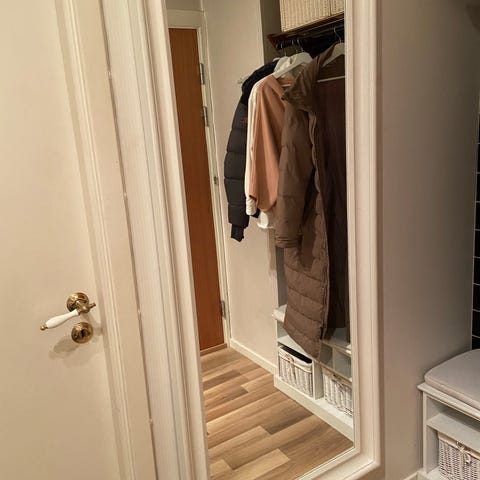 IKEA speil med hvit ramme. Rektangulært veggspeil med speilflate og enkel, glatt ramme i lys/hvit farge. Baksiden har opphengsløsning for montering på vegg. Egner seg til bruk i gang, soverom, stue eller andre rom der det er behov for et større speil.