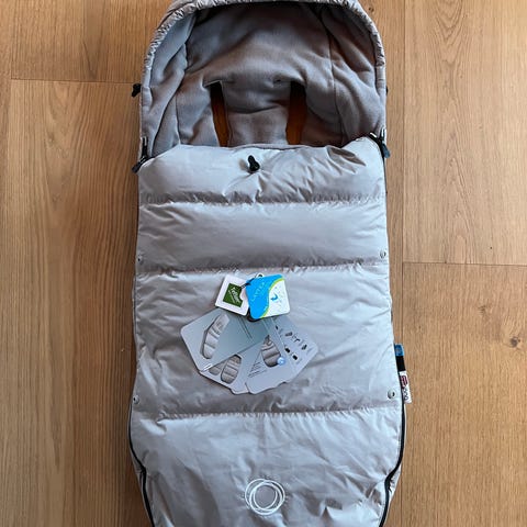 Bugaboo vognpose i lys grå farge. Vognposen består av bakdel og to dyner, en i fleece og en med dun. Det er glidelås og trykknapper for lukking og justering. Den har åpninger for seler slik at den kan festes i barnevognens selesystem. Mykt og polstret materiale gir god beskyttelse mot vær og vind. Passer i de fleste Bugaboo-barnevogner og andre vogner med standard seleoppsett. Den ene glidelåsen er byttet, men ikke optimal, bør byttes.