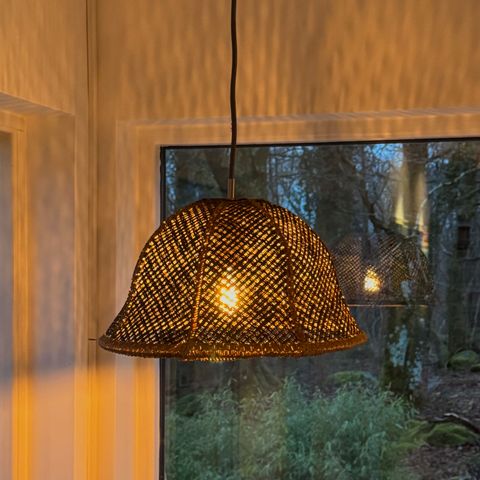 San Carlos Hanging Lamp fra Riviera Maison. Nydelig lampe i bambus. Mål; Høyde 54cm (70cm med håndtak) Diameter; ca 60cm. Pent brukt, ingen skader. Nypris 2399,-
