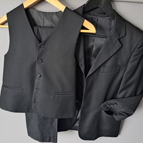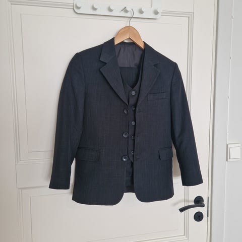 Godt brukt dress til gutt. Str 10 år. Blå farge, vest, jakke og bukse. En defekt knapp.