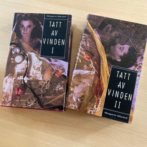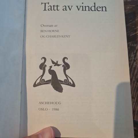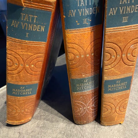 Margaret Mitchell "Tatt av vinden" boksett i tre bind, norsk oversettelse ved Ben Horne og Charles Kent. Utgitt av H. Aschehoug & Co. (W. Nygaard), Oslo 1937. Innbundne bøker med rygg i lær og preget dekor. Romanen er fordelt på bind I, II og III, med tittelblad og kartillustrasjon i starten av første bind. Egner seg for lesing på norsk og som komplett sett i bokhylle eller samling av klassisk litteratur.