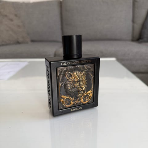 Rayhaan Eau de Parfum dameparfyme. Flakongen har et dekorativt design i gull og røde toner, og leveres med tilhørende eske.