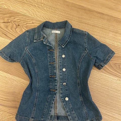 Gina Tricot denimskjorte for dame i størrelse S. Skjorten er i blå denim og har klassisk skjortekrage og knapping foran. Den har brystlommer med klaff og lange ermer med mansjetter. Passer til hverdagsbruk og kan brukes både åpen over topp eller lukket som vanlig skjorte.