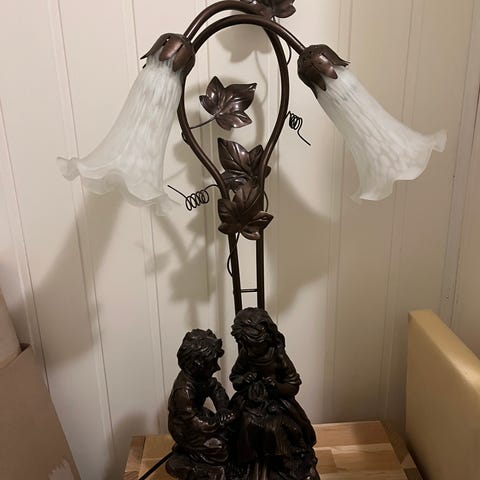 Selger en flott og dekorativ bordlampe med to glasskjermer i blomsterform. Lampen har en klassisk/romantisk stil med skulptur av to barn som motiv i sokkelen.