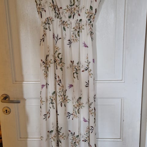 Floyd sommerkjole i størrelse L. Kjolen er hvit med blomstermønster og er laget i polyester. Modellen har lange ermer og strikk i livet som gir en lett innsvinget fasong. Stoffet er lett og egner seg til bruk på varme dager eller til hverdags og enkle anledninger.