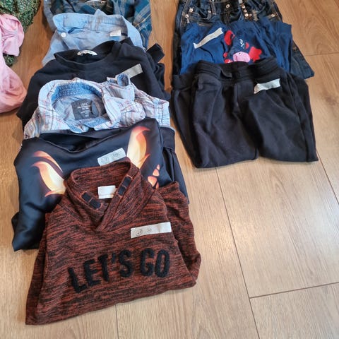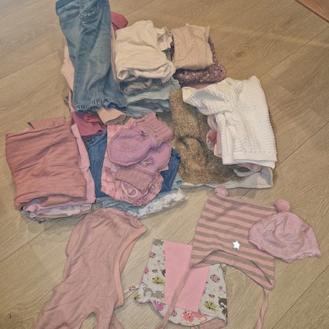 Liten klespakke med 3 bukser, 1 ulloverdel, 1 genser og 2 kjoler