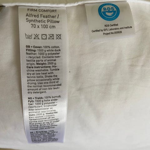 Fyll består av 60 % hvite andefjær og 40 % mikrofiber.