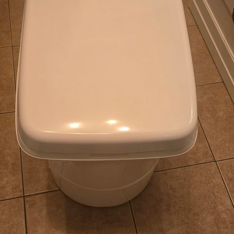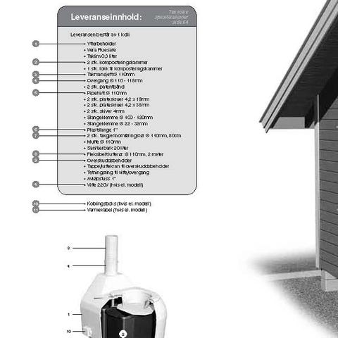 Toalettskålen er i hvit porselen med integrert sisterne-/teknikkdel. Systemet inkluderer vakuumpumpe (vakumator) og separat komposteringstank i plast med lokk og lås.