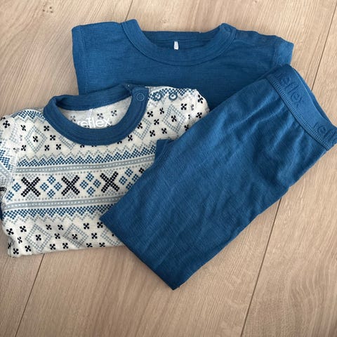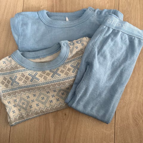 Joha body og bukse i merinoull for gutt i størrelse 50. Sett med langermet omslagsbody og bukse med ben. Veldig praktisk å slippe sokker på baby. Finner ingen flekker eller hull. Pent brukt.