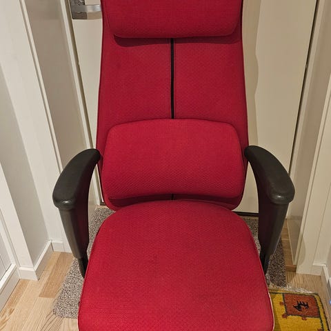 Denne modellen er trukket i rød tekstil og har et særpreget uttrykk som virkelig skiller seg ut i rommet. Perfekt for deg som liker space age-design, retrofuturisme eller ønsker et blikkfang i interiøret.