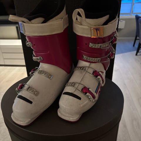 Lange Starlet alpinstøvler i rosa og hvit farge. Støvlene har fire justerbare spenner i metall for god tilpasning rundt fot og legg. Yttersålen er i plast med utskiftbare såledeler. Modellen er egnet til alpint bruk i vanlige alpinbindinger. Passer til barn eller junior, str. 38