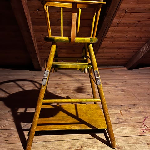 Gammel høy barnestol i tre med naturfarget finish. Stolen har rund rygg med sprosser og enkel sele foran. Den har fotbrett og stor bunnplate for stabilitet. Barnestolen kan legges ned og brukes som lav stol med bordflate og kan trilles på hjul. Egnet som sitteplass ved spisebord eller som aktivitetsplass for små barn, avhengig av barnets alder og behov. Materiale er treverk med plast-hjul på sidene for enkel forflytning på gulv.