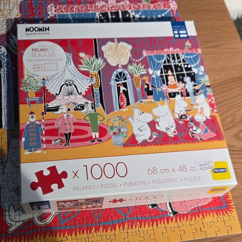 Mummi puslespill med motiv fra Mummidalen. Puslespillet består av 1000 brikker og ferdig størrelse er 48 x 68 cm. Motiv med Mummifamilien foran husdøren omgitt av blomster og natur. Egnet som puslespill for ungdom og voksne som liker Mummi-motiver og klassiske illustrasjoner.