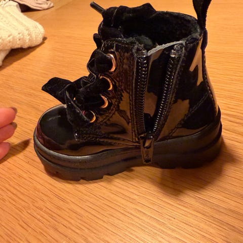 H&M barnesko for jente i størrelse 18. Skoene har rosa glitterfinish og kraftig, mønstret yttersåle i gummi for bedre grep. Lukkes med glidelås i siden og har lisser foran. Passer som hverdagssko eller til penere anledninger for små barn.