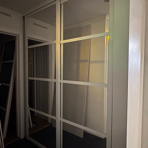 Hel garderobeløsning gis bort mot henting og demontering. Inkluderer kurver, overhylle, dører, skinner etc.