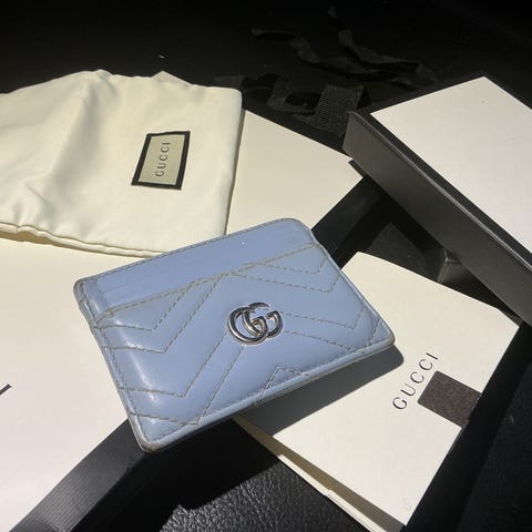 Selger en original kortholder fra Gucci i klassisk GG Supreme canvas med skinnkanter og metall GG-logo foran.