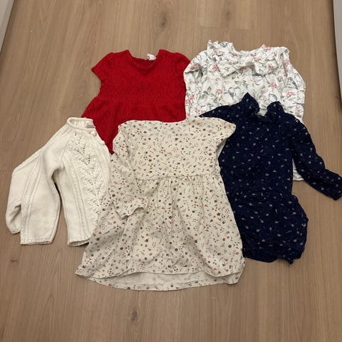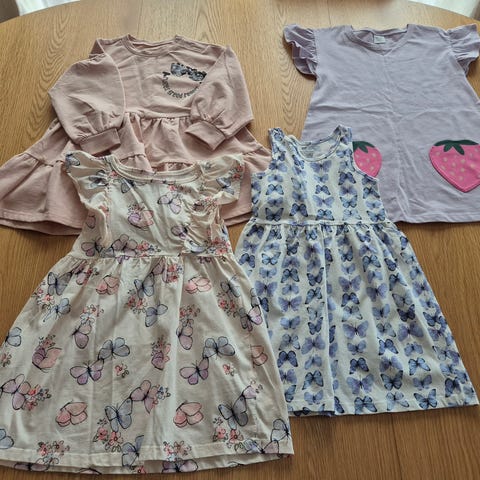 Tre pent brukte kjoler i str 86 cm og tre strømpebukser i str 86/92 cm.