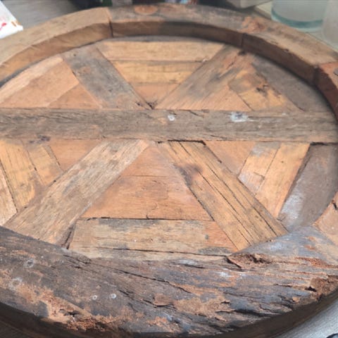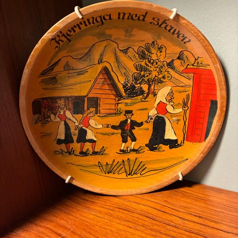 Dekorasjonsfat i tre med sekskantet form. Fatet har håndmalt motiv av same i fjellandskap og innskriften «Sørreisa» øverst i motivet. Forsiden er dekorert med grønn kant rundt motivet, baksiden er glatt med enkel merking. Egner seg som vegg- eller borddekorasjon.