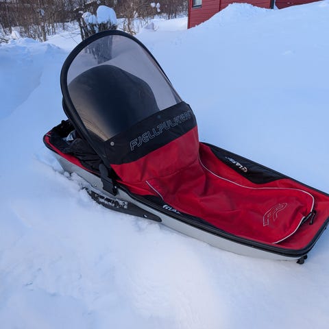 Leier ut en eldre modell av fjellpulken for barn. Den er hel og fin og har veltebøyler. Drag følger med. Vinterpose/vognpose følger ikke med. Den er ikke isolert i bunn, men følger med et liggeunderlag som brettes nedi. Ungene våre har stortrivdes oppi.
