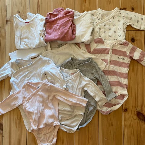 Klespakke for jente i str 62. Fra røyk- og dyrefritt hjem. Sett over klærne og kunne ikke se noen flekker eller hull.
