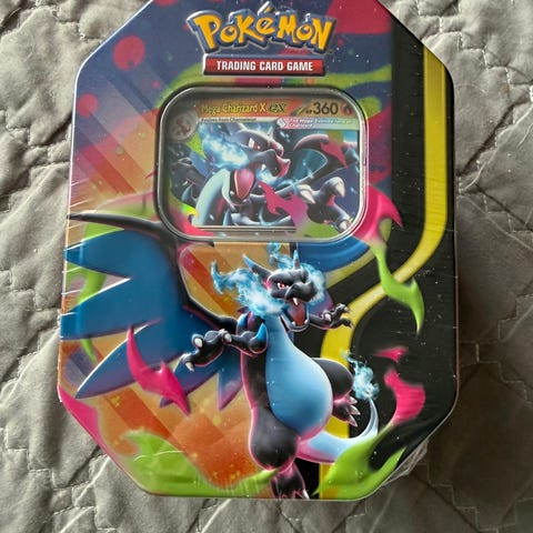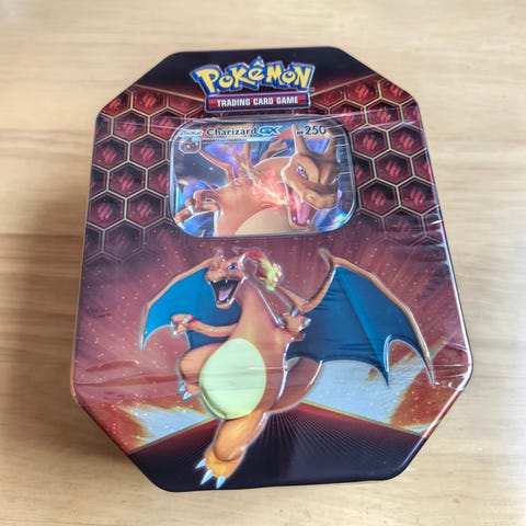 Samleboks i metall (tin) med motiv av Charizard. Boksen inneholder et Charizard EX-kort og flere Pokémon TCG-boostere (antall og serier varierer etter utgave, se tekst på esken for eksakte detaljer). Egnet for samlere og spillere av Pokémon Trading Card Game.