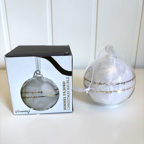 Dette er en Magnor julekule fra serien "Himmel på jord", som er munnblåst og fylt med hvite "englefjær".