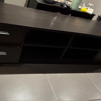 Tv-benken har fått et hull oppe på venstre side etter forrige flytting.