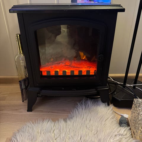 Overflate og kanter har enkelte synlige merker og slitasje, som vist på bildene. Egner seg som dekorativ varmekilde eller stemningsbelysning i stue eller andre oppholdsrom, innenfor produsentens anvisninger for plassering og bruk.