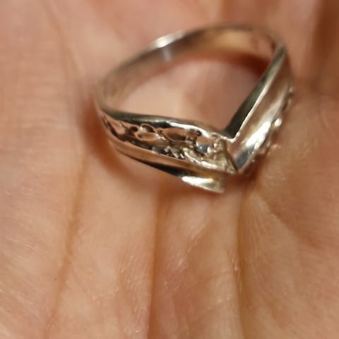 Søt ring i størrelse 54 (det vil si at ringens indre diameter er 17,2 mm). Den er ca. 9 mm bred på det bredeste foran. Ringen ser ut til å være av sølv, men jeg finner ikke noe stempel, så jeg selger den derfor rimelig.