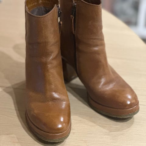 Materialet er i glatt skinn med skinnfor, og veldig komfortable. Hælhøyden er på 7,5 cm.
