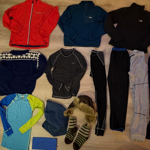 Klespakke med ull og fleece str. 6-8 år. Det meste er pent brukt, et par plagg har noen små hull, se bedre beskrivelse under bilder :)