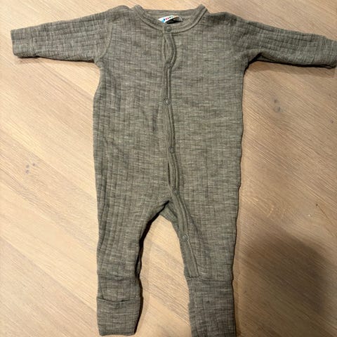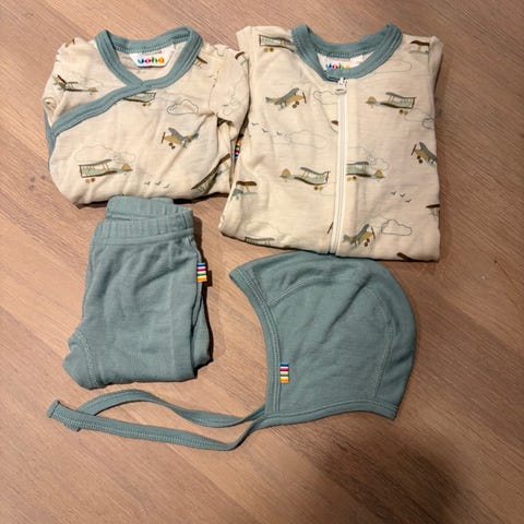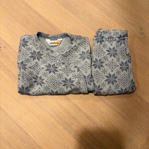 Joha heldress i merinoull for gutt. Strørrelse 50. Heldressen er blå med mønster og har lange ermer og lange ben med tryllefot slik at man slipper sokker. Glidelås foran gjør den enkel å ta av og på. Finner ingen flekker eller hull. Pent brukt.