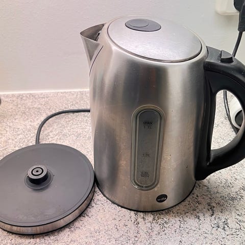 Wilfa vannkoker i rustfritt stål med svart håndtak. Vannkokeren har vindu på siden for nivåindikator og strømledning med jordet plugg.