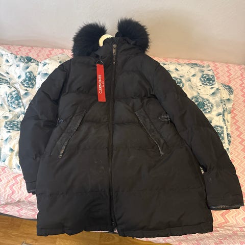 Clermonte lang dunjakke for dame i svart farge. Jakken er lite brukt