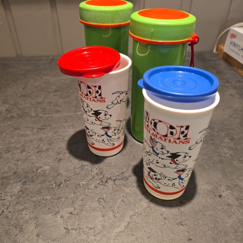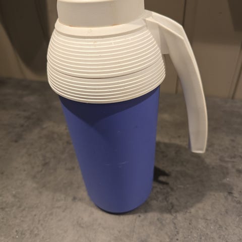 Tupperware mugge i blå plast med hvitt lokk. Kaffekanne. Holder godt på varmen. Ikke brukt