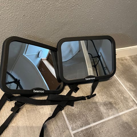Bilspeil fra Beemoo. Speilet har synlige riper midt på dersom man ser nærme, men det ser man ikke på avstand. Selges derfor billig.