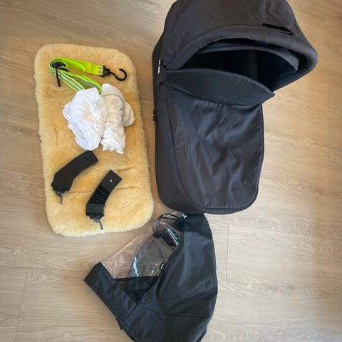 Thule bassinet bagdel i svart farge. Passer Thule Urban Gilde 2. Brukt noen mnd på 2 barn men med saueskinn mellom vogn og vognpose. Dette kan følge med gratis. Myggnetting og adaptere følger også med. Ingen skader eller bruksmerker.