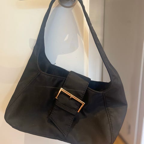 skulderveske i lær til dame. Vesken er i svart skinn med kontrastfelt i mørkt semsket materiale på front og bakside. Den har justerbar skulderrem med metallspenner og metalldekor på fronten. Innvendig har vesken fôr og glidelåslomme. Egnet som hverdagsveske eller til enklere antrekk der man ønsker en kompakt skulderveske i skinn.