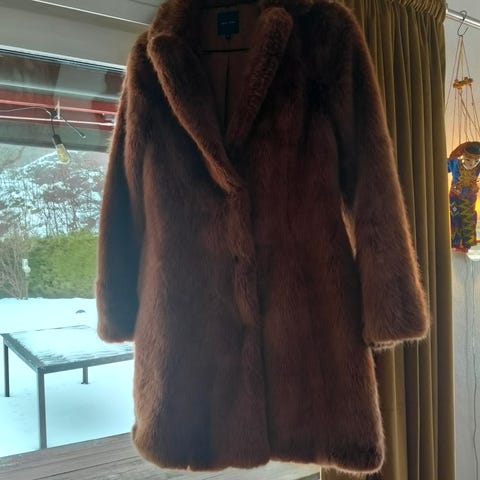 Superfin fuskepels kåpe fra Line of Oslo. Helforet med lommer i siden og knytebelte. 3 trykknapper holder jakken sammen. Brukt 2-3 ganger