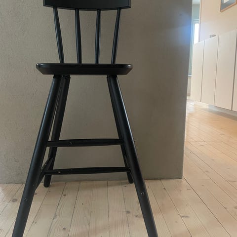 IKEA høy barnestol i hvit farge. Klassisk trestol med høy sittehøyde, rygg med spiler og fotstøtte. Egnet som ekstra høy stol til barn ved spisebord eller kjøkkenbenk. Nøytral farge som passer inn i de fleste interiører.
