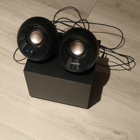 Aktivt høyttalersystem med to enheter beregnet for bruk med PC, bærbare spillere og annet lydutstyr med 3,5 mm minijack-utgang. Høyttalerne har innebygd forsterker, volumkontroll og av/på-bryter på fronten. Strømindikatorlampe viser når systemet er i bruk. Kablet tilkobling via fastmontert 3,5 mm plugg. Farge: svart.