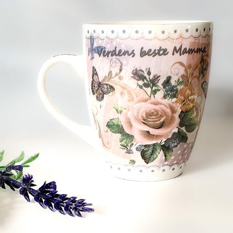 Sjarmerende kopp med teksten Oldemor i gullfarget skrift og dekorative rosemotiver. Hvit porselenskopp med gullfarget kant øverst. Perfekt som gave eller til en som er oldemor. Fra Thun (Czech Republic). Se bilder for mål. 🌺
