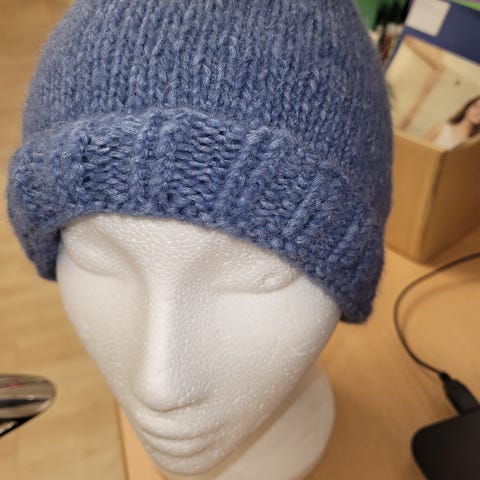 Skjerf 2: har full lengde på 120 cm og kan også knyttes 2 ganger rundt halsen, eller 1 gang med lengre ender som henger løst ned. Fargen på dette skjerfet er en nydelig blå/grå farge.