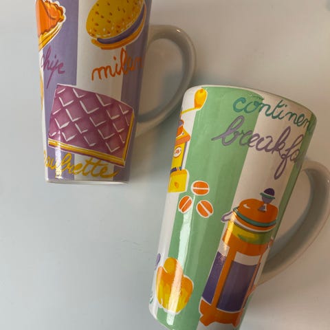 To keramikkrus med tekst og motiv fra Gran Canaria. Ett hvitt og ett brunt. Tekst med "cappuccino, espresso, coffee... Have a good day" osv. Det er plass til skje i hanken. Se bilder for mål. Fine til kaffe, te eller kakao. ☕️