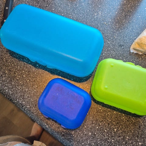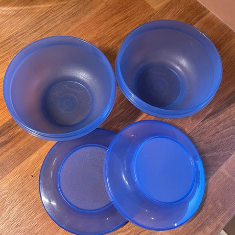 Tupperware matbokser i plast i ulike størrelser og farger. Settet består av rektangulære og kvadratiske bokser med lokk i forskjellige farger, blant annet blå, gul og turkis. Egnet til oppbevaring av mat, rester eller matpakke på kjøkkenet eller til å ta med seg. Laget i plastmateriale til flergangsbruk. Kjøl og frys.